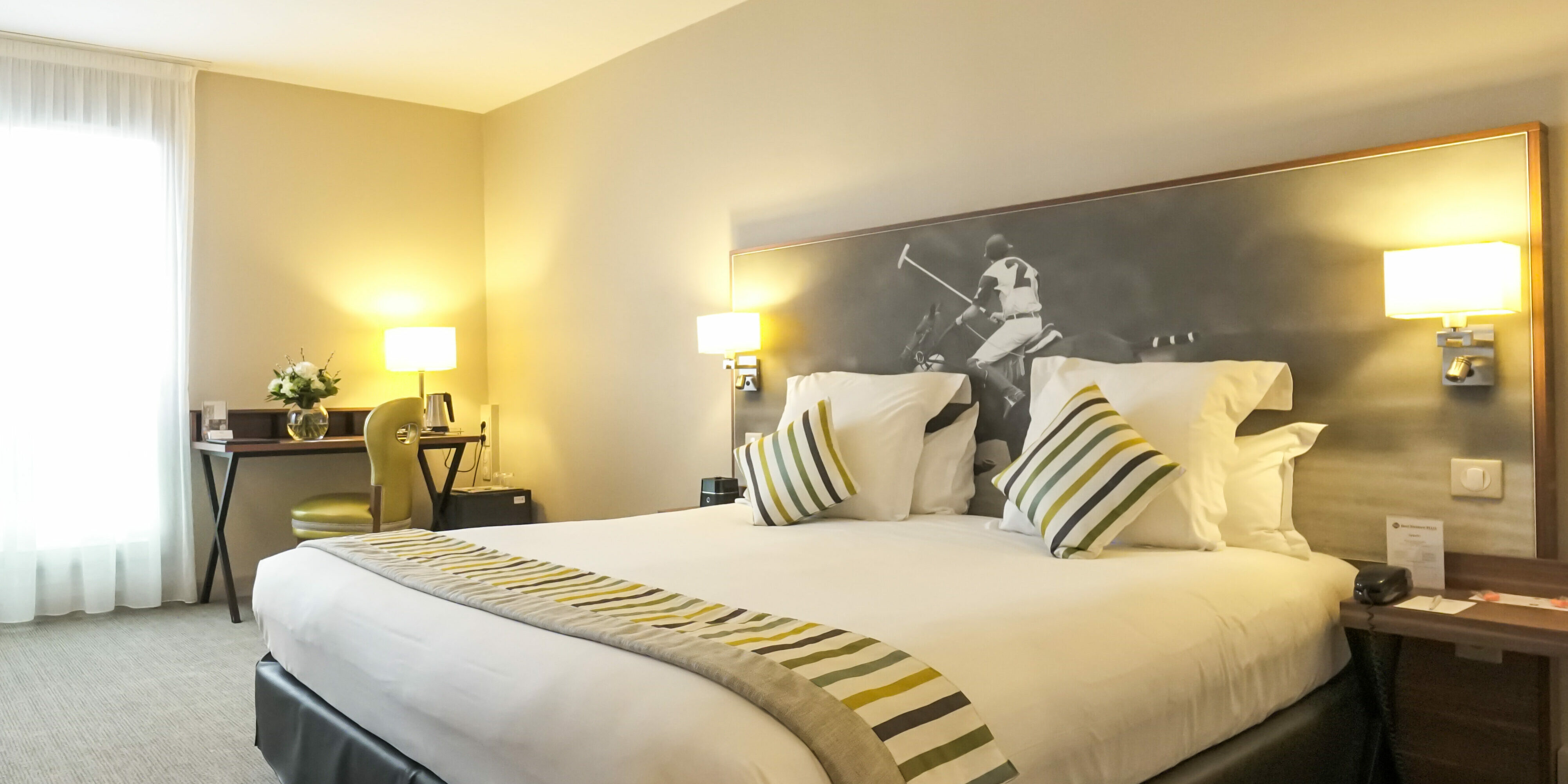 Nos chambres Deluxe, avec ou sans terrasse, offrent un espace généreux et une literie haut de gamme dans une ambiance chaleureuse et chic inspirée de l’univers du cheval, pour un séjour tout en élégance et en confort à Chantilly.