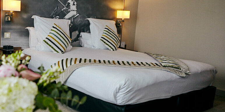 Les chambres Confort queen bénéficient d’une literie haut de gamme dans une ambiance chaleureuse et chic autour du cheval.